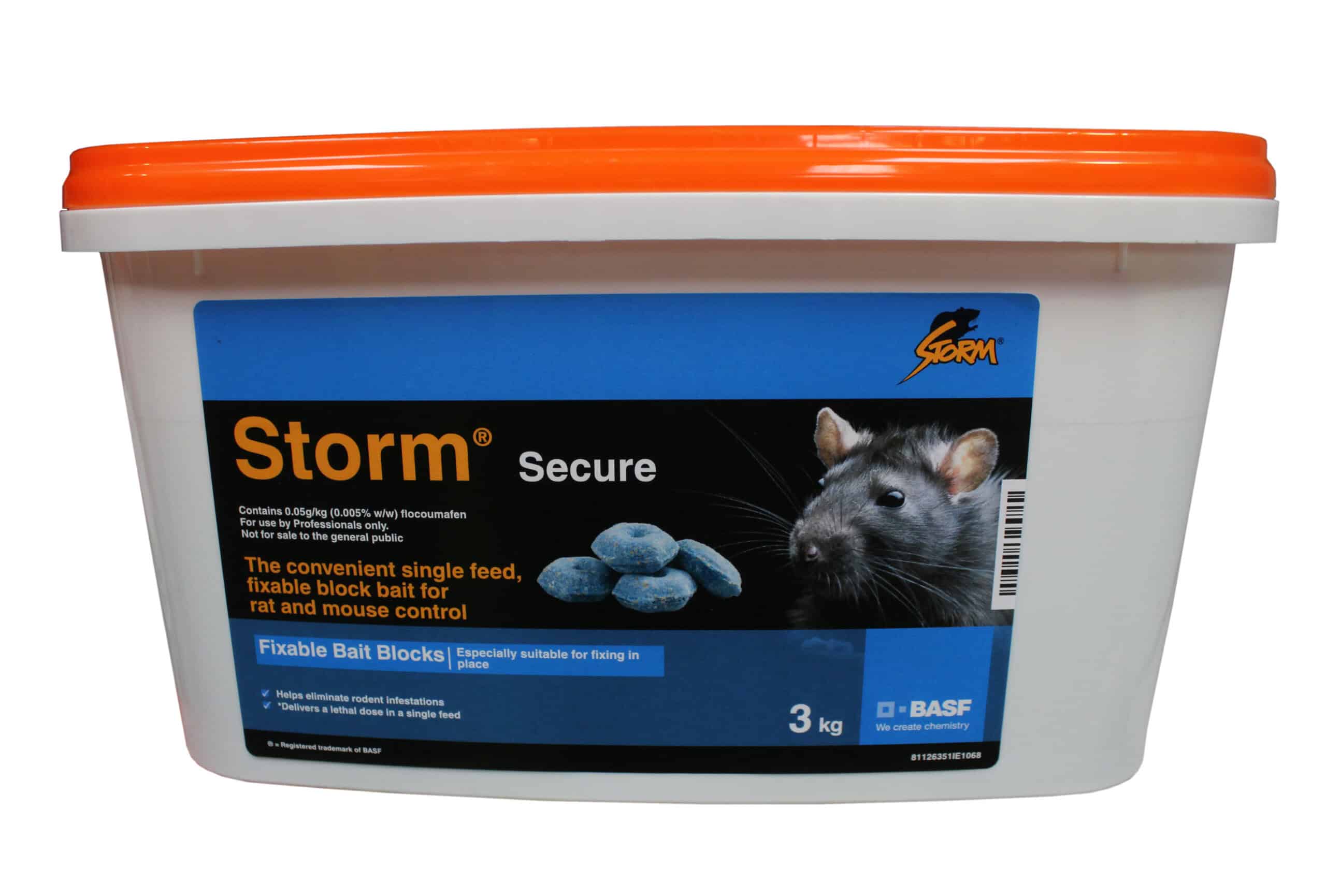 The Storm Rat Poison 10kg tub is made of crushed grain and wax block containing 0.005% flocoumafen and just one mouthful is enough to kill. A blue hexagonal block with a central hole allows each 20gm clock to be anchored securely in baiting points for the best targeting. It is effective against rats and mice including resistant strains. This product is mould and moisture resistant and is for indoor use only. It comes in blocks with a hole so you can secure it on a nail/rod to prevent a rodent from dragging it away.